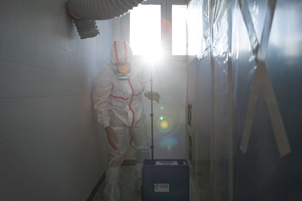 Réalisation de mesures libératoires comme le contrôle visuel et les mesures d'air VDI 3492.